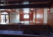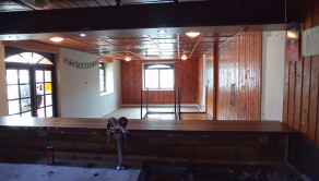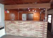 Dispozícia hlavnej budovy: veľká miestnosť s barovým pultom, výčap s bodovým osvetlením, výčap. kompresor a stoly na sedenie.