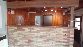 Strop a dve steny sú obložené drevom - tatranským profilom. Za barovým pultom sa nachádza väčšia kuchyňa a sklad.