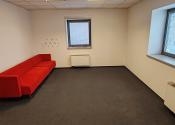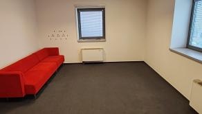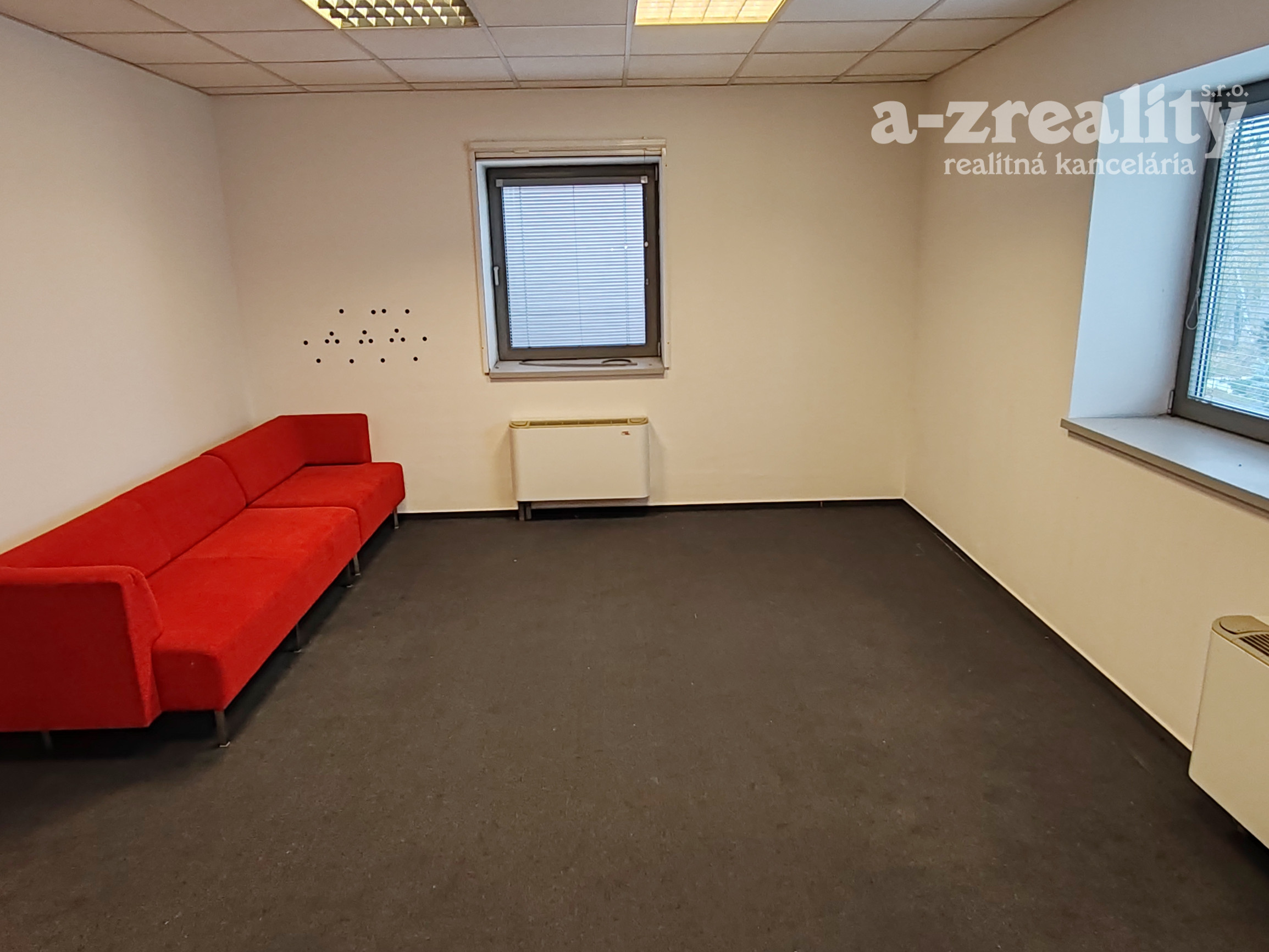 Veľké hliníkové okná zabezpečujú dostatok svetla, k dispozícii je červená pohovka, prípadne vybavenie ostatných voľných kancelárií v budove.