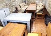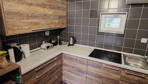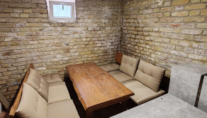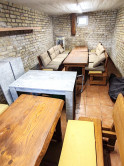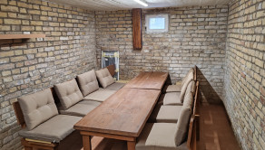 Dispozícia: znížené prízemie pozostáva z veľkej prednej miestnosti, samostatnej kuchyne a veľkej spoločenskej miestnosti s masívnymi drevenými stolmi a lavicami.
