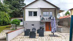 Na zvýšenom prvom podlaží sa nachádza predsieň so spojovacou chodbou, 2 spálne, kúpeľňa a samostatná toaleta. Z jednej izby sa vychádza na balkón. K dispozícii je tiež murovaná garáž, balkón, úložný priestor pod schodiskom a veľká terasa.