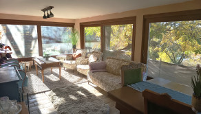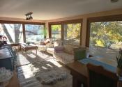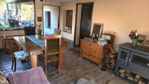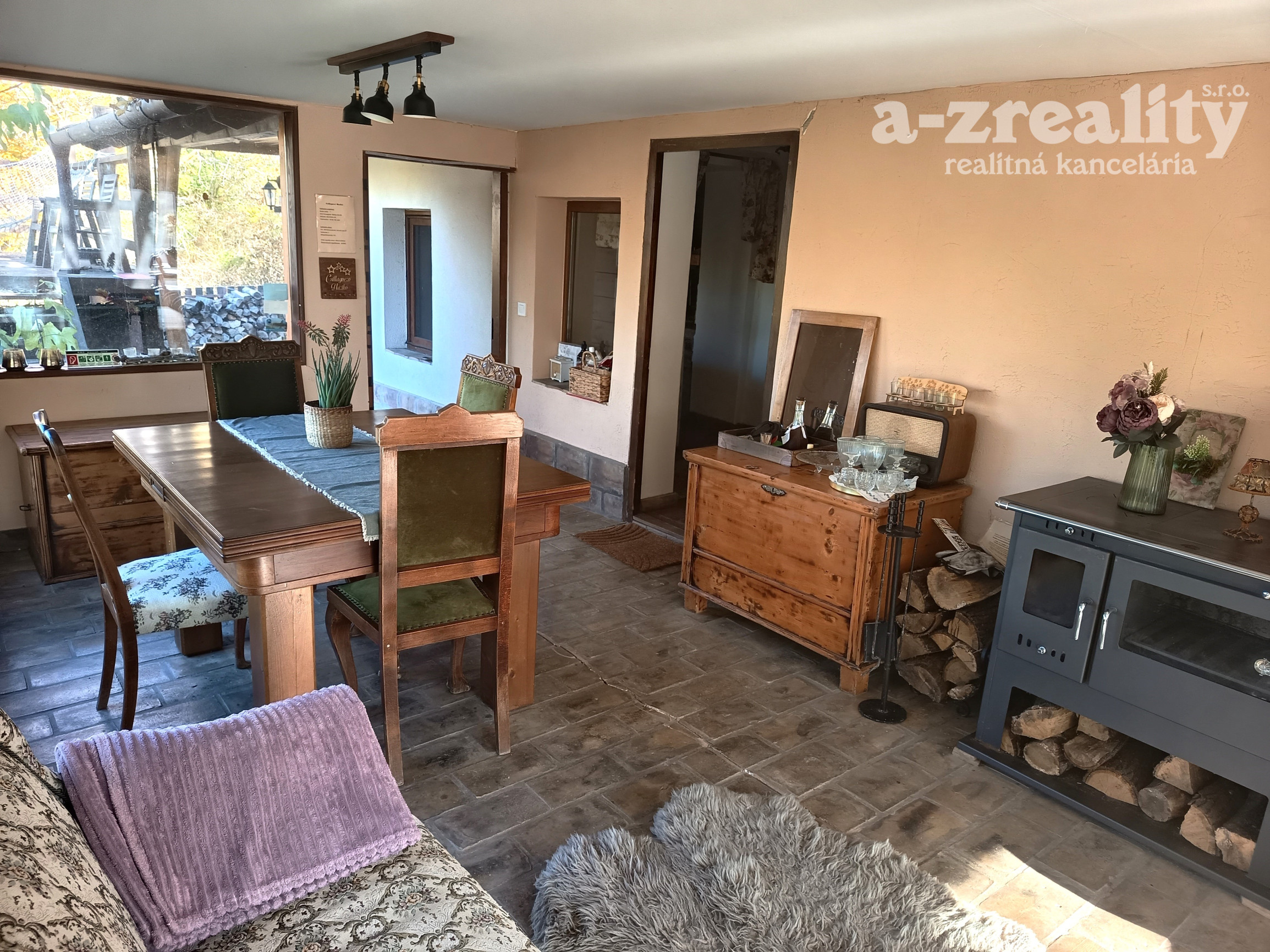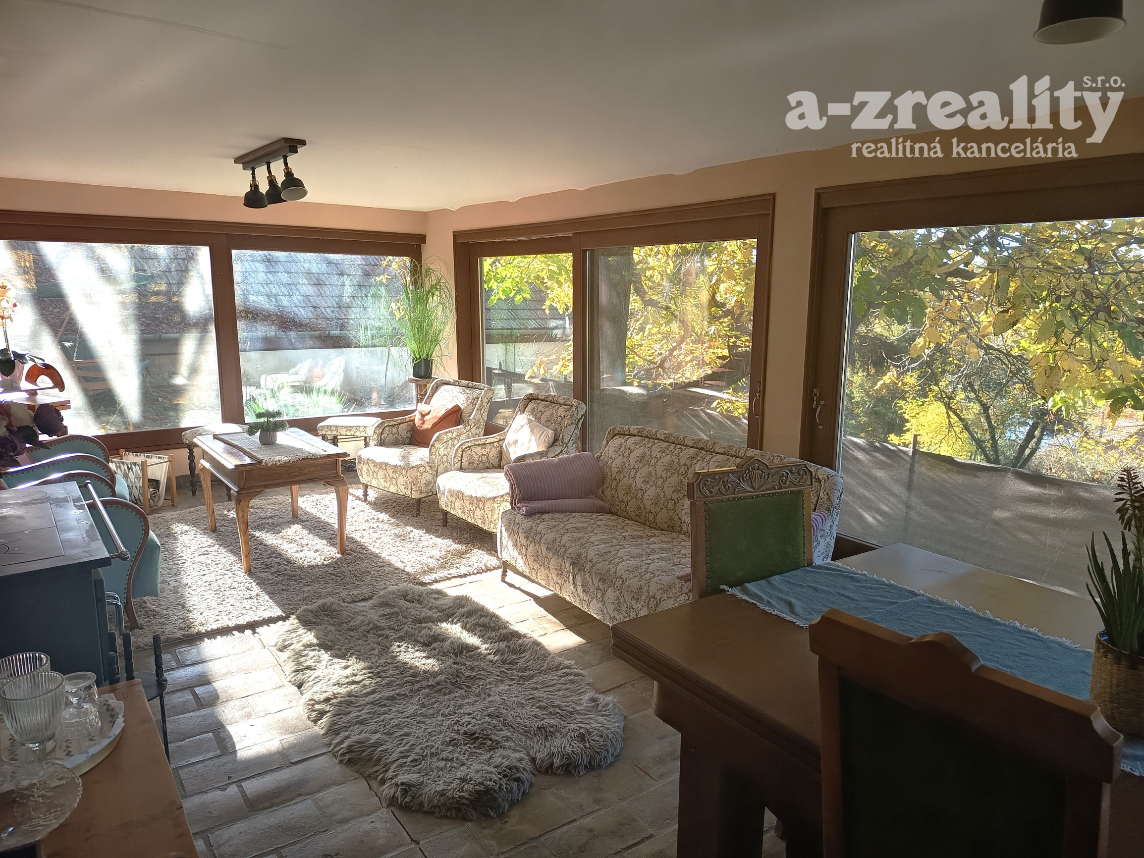 - samotný dom je 3 izbový s výbornou dispozíciou: priestranná presklenná zimná záhrada zariadená ako obývačka s posedením, jedálenským stolom, s pieckou na tuhé palivo