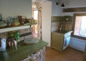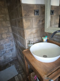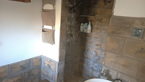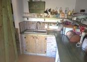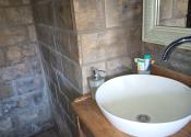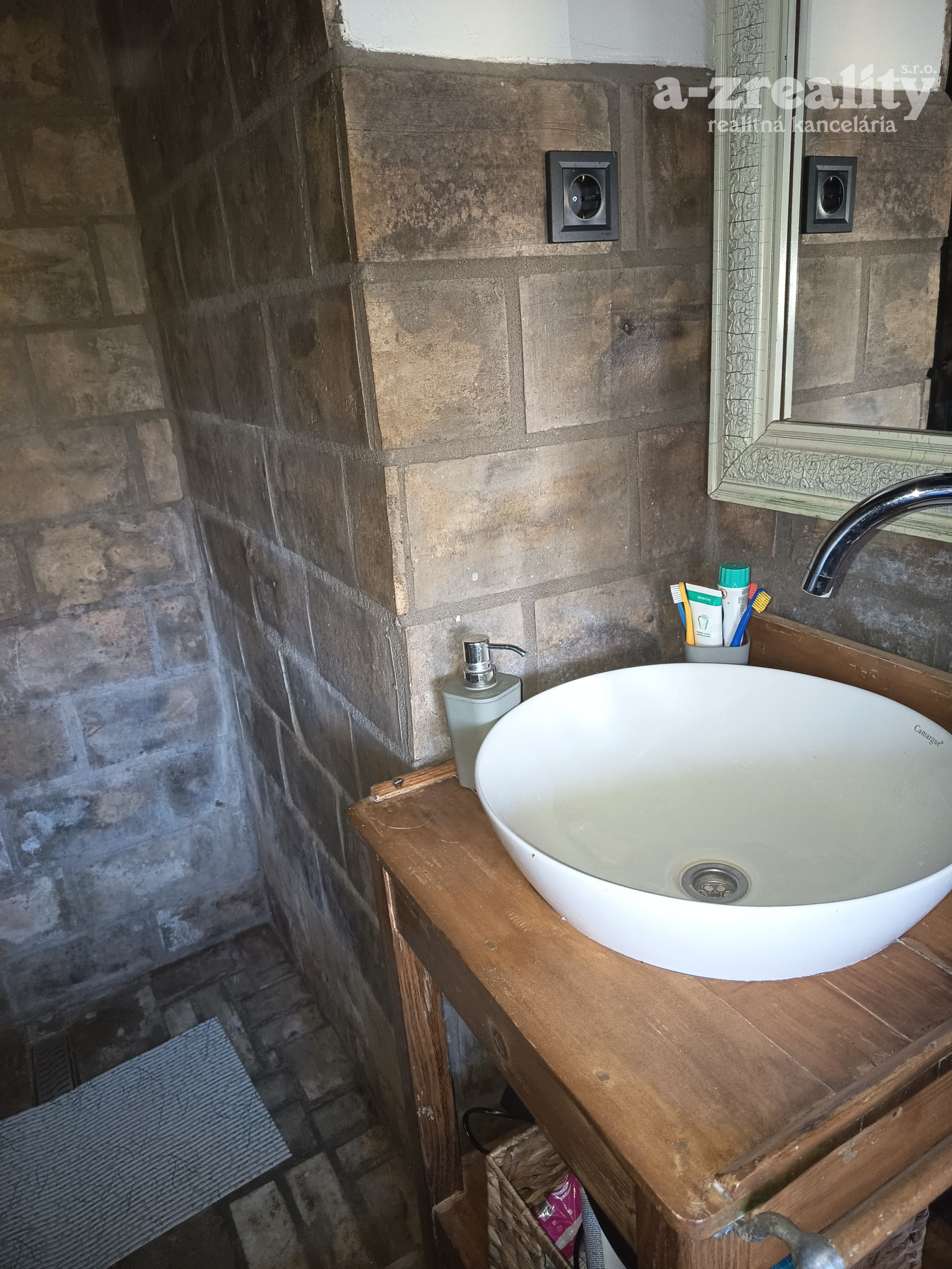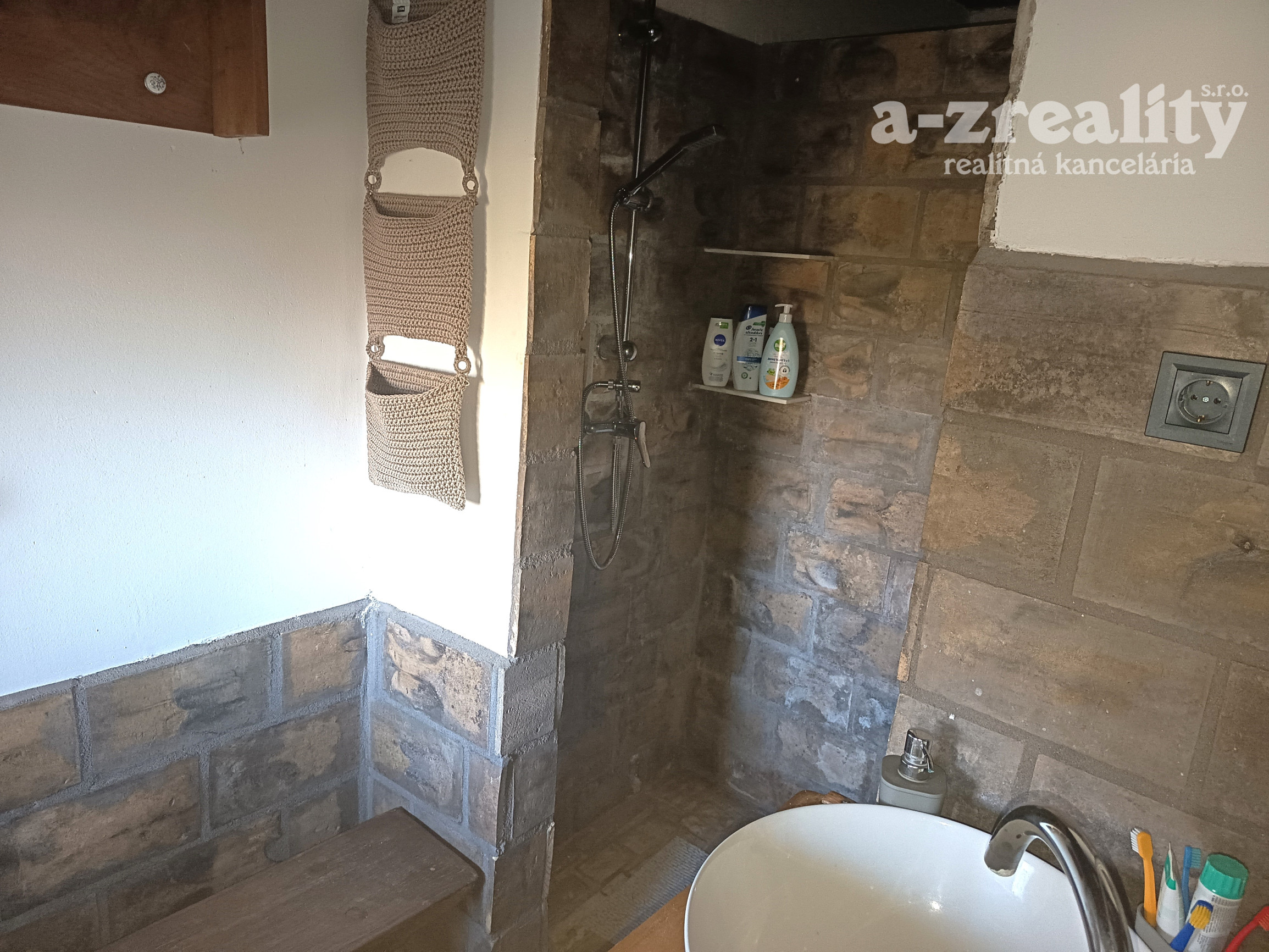 z kuchyne je prístup posuvnými dverami do samostatnej toalety a do kúpeľne, ktorá je vybavená umývadlom so zrkadlom a murovaným sprchovým kútom