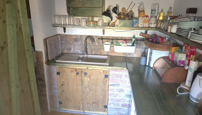 v malej štýlovej kuchynke je všetko potrebné k príprave jedál, malá chladnička, odkladacie skrinky