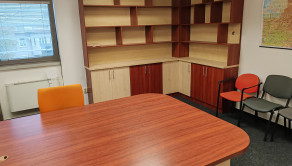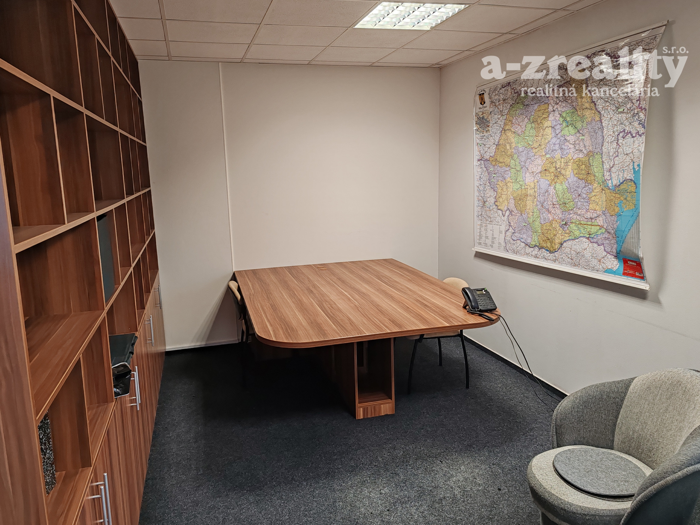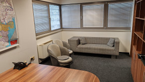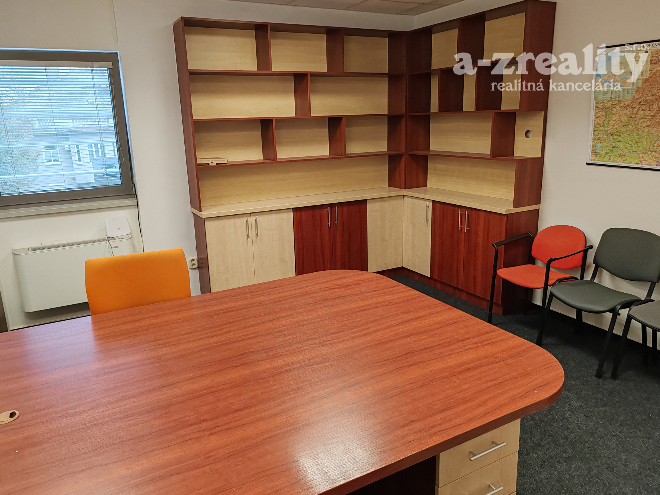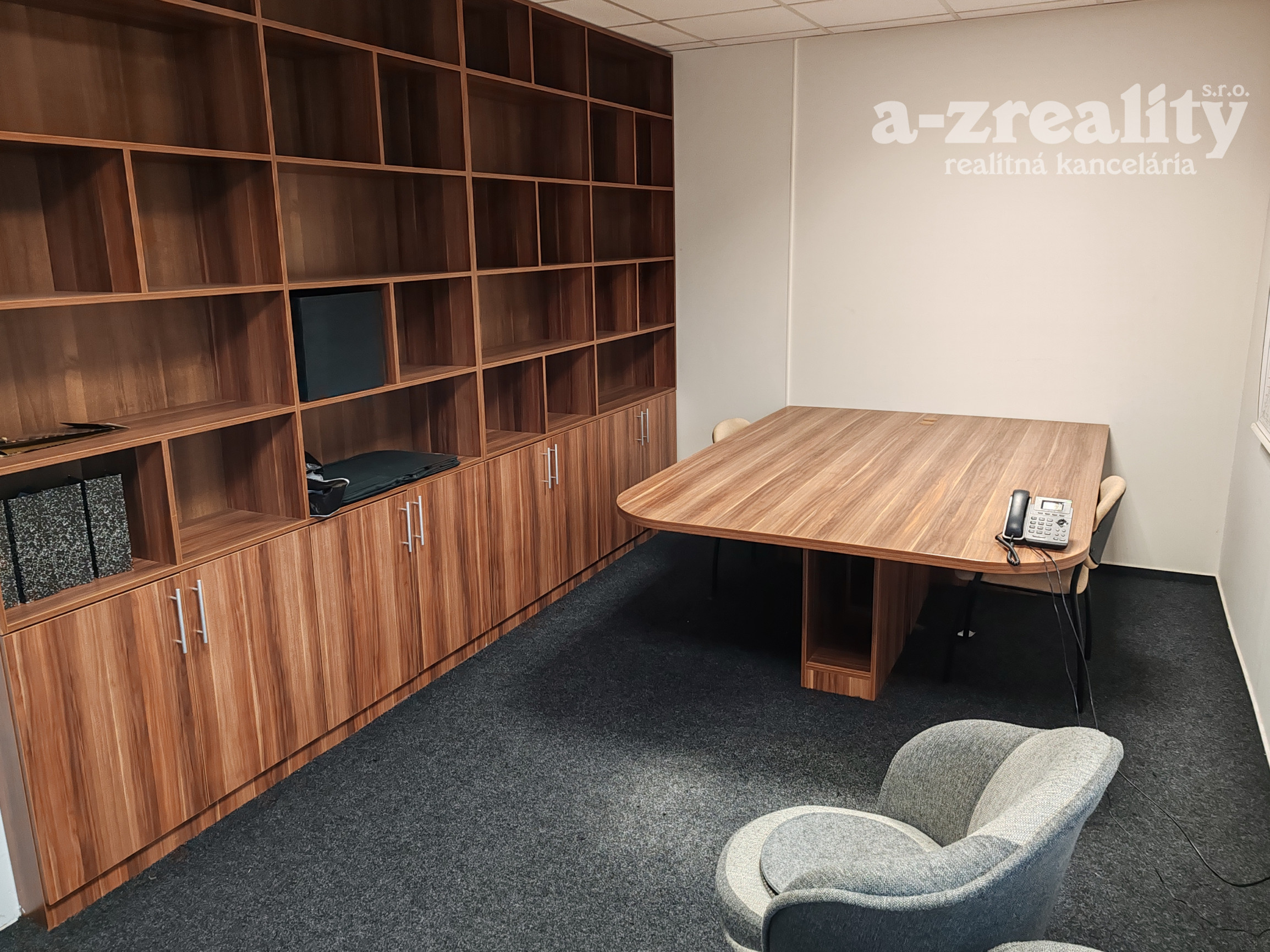 Dispozícia: zariadená rožná kancelária s pekným výhľadom, konferenčným stolom, policovými regálmi a gaučom. V druhej zariadenej kancelárii je okrem stola, kancelárskych stoličiek a skríň s poličkami aj menšia kuchynská linka.