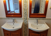 V druhej kúpeľni sa nachádza vaňa, práčka a dve umývadlá.